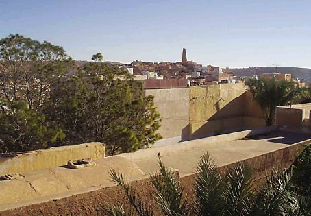 Ghardaïa, c'est un groupe d'oasis, une agglomération de quelque 100 000 habitants ; c'est le centre du diocèse le plus vaste du monde, le Sahara, grand comme quatre fois la France. A flanc de colline, derrière des murs couleur d'argile, la résidence de l'évêque et de ses compagnons ne se distingue guère des autres maisons. Un cloître et quelques arcades bordent un petit jardin ombragé ; les murs de la maison sont très épais, une terrasse tient lieu de toiture ; un clocheton surmonté d'une simple croix blanche est le seul signe de la présence chrétienne. Cinq fois par jour, les appels tout proches des muezzins résonnent en cacophonie jusqu'à l'ombre des faux poivriers et dans la fraîcheur des maisons. "Allah akhbar ! Dieu est grand !" se répondent les croyants, d'un minaret à l'autre.