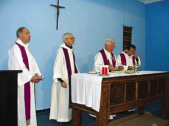 Mgr Georger, évêque d'Oran et le Père LarburuLa cathédrale ? Ce sera la salle de conférence attenante à l'évêché, à côté de la bibliothèque et de quelques salles de réunion ; les gradins en pente sont remplis, une centaine de places, face à une plateforme étroite, une table couverte d'une simple nappe, quelques chaises de plastique, dont une ornée d'une tenture orientale : c'est la cathédrale d'un soir. La pauvreté à l'état pur !