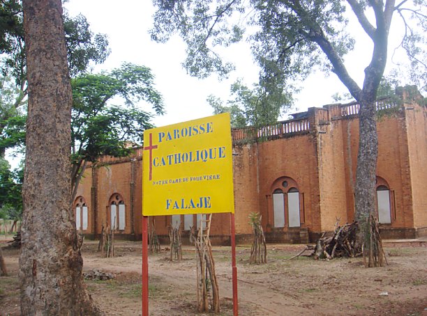 Faladje est le but de notre prochain déplacement. Quel plaisir de traverser un paysage aux contrastes si forts : un ciel bleu, beaucoup de verdure et la piste rouge. Nous apprécions le grand calme après l’atmosphère bruyante et trépidante de Bamako. Nous arrivons en même temps qu’une pluie fine dans l’ancienne Mission tenue par les Pères Robin, Martinez, Bonfanti et Drani.