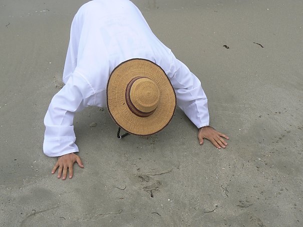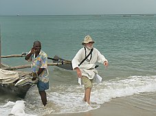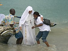 Après un bon repas au Centre spirituel et la photo souvenir, il est proposé une mise en scène sur la plage : l’arrivée des premiers missionnaires, Sœurs, Frères et Pères, sur la rive de Bagamoyo. Un petit voilier amène 2 Sœurs Blanches, dans leurs longs et lourds habits avec le scapulaire et le voile, et 3 Pères Blancs, en gandourah et rosaire. Un des Pères, comme touchant la «Terre Sainte», embrasse la plage, remerciant Dieu pour le bon voyage qu’ils ont fait.