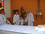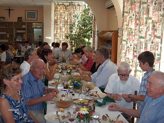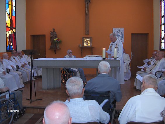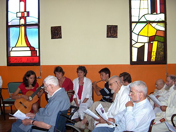 Grande fête familiale avec la communauté et 43 personnes de sa famille, dont un grand nombre ont passé deux jours à Tassy. Le samedi 5 aout à 11 heures Grand messe solennelle- présidée par le père Provincial Louis Venhet,- Homélie remarquée de circonstance du père jean Fisset. Animation et acompagnememnt instrumemntal de la famille ( flutes, guitarre) - remise des souhaits du conseil général et du Pape. Quelques religieuses de maisons ou nous célébrons la messe étaient présentes.
