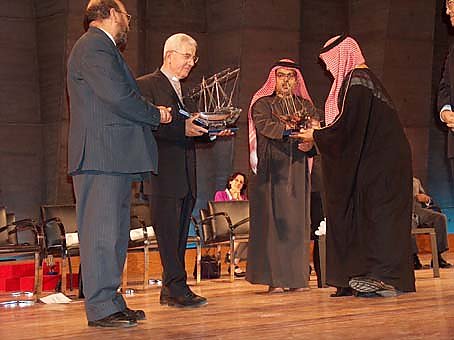 De haut en bas : Les lauréats reçoivent un bateau en argent, lemblème de Sharjah Le Sultan Bin Mohamed Al-Qassimi, gouverneur de Sharjah Remise du Prix Michel Lagarde prononce son discours.