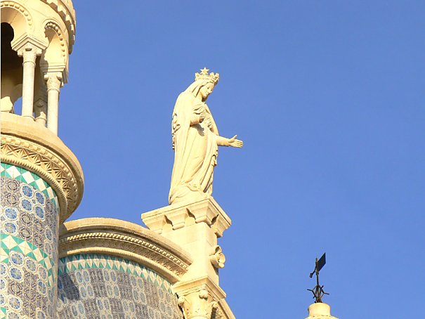 Située sur la commune de Bologhine, au sommet d’un promontoire dominant la Méditerranée, la basilique Notre Dame d’Afrique est édifiée au milieu du XIX° siècle. Le gros œuvre est achevé en 1866 et l’édifice est terminé et consacré en 1872. La basilique est construite sur un plan en croix latine. Elle est marquée par un style éclectique, inspiré par des références romanes, byzantines et mozarabes. Le décor intérieur fait une large place aux ex-voto déposés depuis 150 ans par Chrétiens et Musulmans. Aujourd’hui, la basilique est fréquentée quotidiennement par 300 personnes environ (plus de 100 000 visiteurs chaque année).