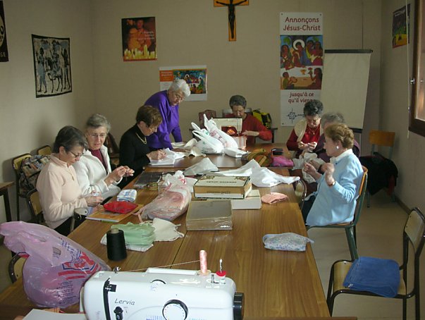Lorientation de lOuvroir Notre Dame dAfrique est toujours restée la même : le service de lÉglise en Afrique. Mais il a fallu sadapter aux changements de situations. Le poids des ornements rendait les colis lourds et surtout le prix de lexpédition devenait insupportable. Quand les étudiants Pères Blancs sont arrivés à la Fraternité Lavigerie, lactivité essentielle a été la confection daubes pour les futurs diacres. Maintenant que la maison de formation a émigré en Afrique lobjectif est resté le même : le produit de chaque Vente-Expo est envoyé à Abidjan afin de subvenir à lachat des tissus pour la confection des aubes destinées aux futurs missionnaires dAfrique. Le groupe se réunit tous les quinze jours, laprès-midi, pour préparer les ouvrages qui seront présentés à la prochaine vente qui dure trois jours.