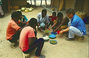 Jean Baptiste arrive : c'est le catéchiste. "Comment çà va ? … et ta famille ? … le village ? - comment vont les pères et les gens de la paroisse ? " Il y a toujours des nouvelles à partager. Et puis, le programme est mis sur pied : visites à faire, un chef à saluer, une famille endeuillée, des malades à soutenir. Quelques rencontres sont prévues : le conseil local des chrétiens, les catéchumènes, les catéchistes bénévoles, les jeunes de la chorale, des parents qui demandent le baptême pour leur bébé, des fiancés ou des couples déjà formés qui demandent le sacrement de mariage, ou tout simplement un ami qui vient passer un moment. L'un d'eux m'apporte un poulet, une vieille grand-mère m'offre quelques œufs, des épis de maïs frais qu'on fera rôtir sur le feu de bois, ce soir, sous les étoiles.